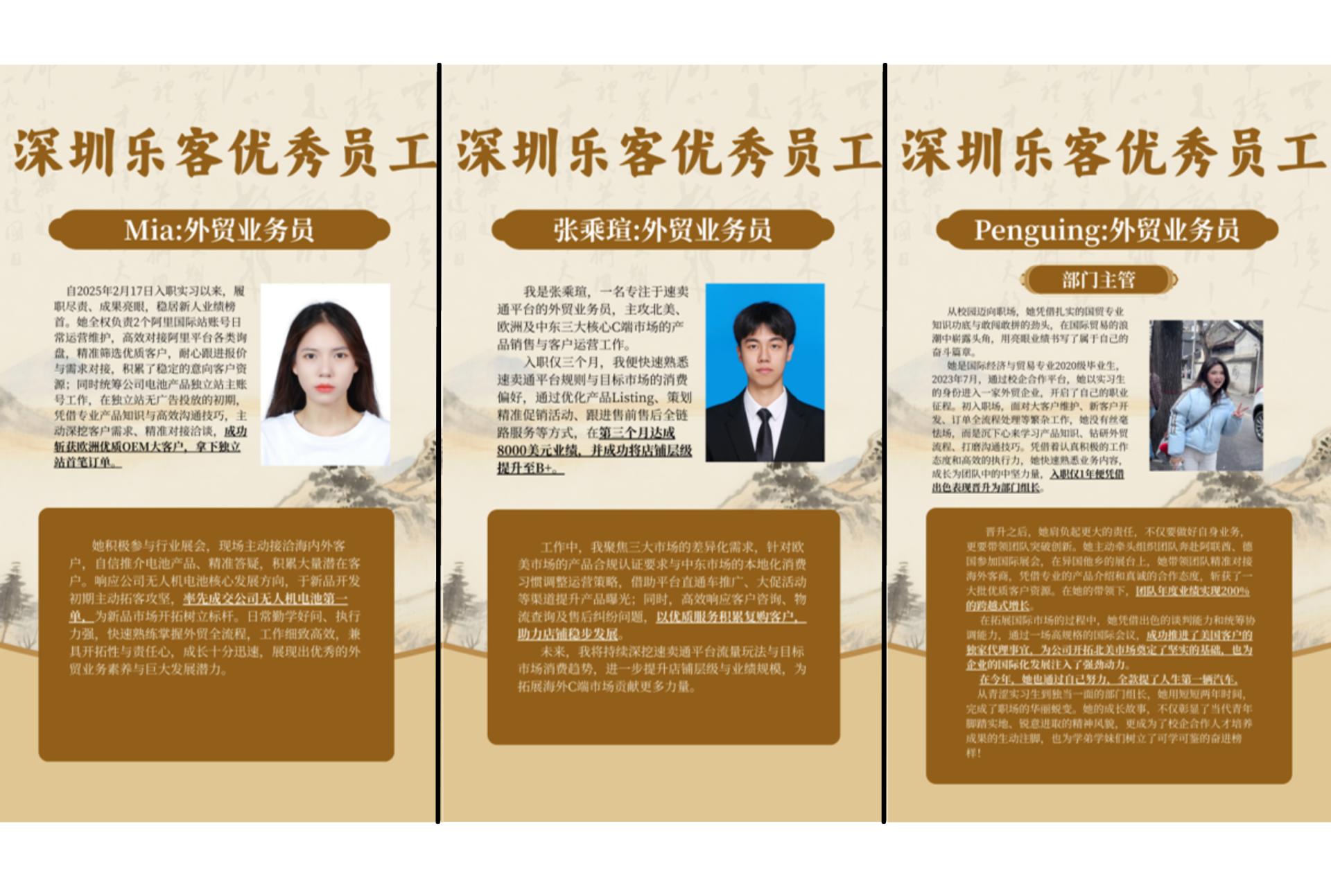 外贸与外语学院2026届深圳乐客跨境电商订制班学生获合作企业“优秀员工...近日,外贸与外语学院在与校企合作单位深圳乐客企业咨询有限公司开展的“跨境电商订制班”联合培养工作中喜获佳讯——张乘瑄等6名学生因表现优异,被企业授予“优秀员工”荣誉称号。优秀员工事迹(一)优秀员工事...