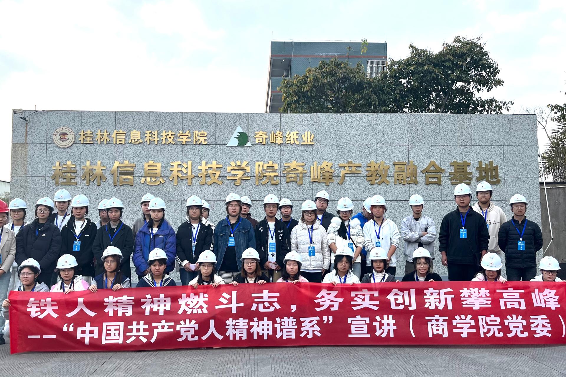 商学院师生赴奇峰纸业开展“中国共产党人精神谱系”宣讲为深入学习宣传贯彻中国共产党人精神谱系,推动理论学习与企业实践深度融合,12月2日,商学院第一教工党支部朱泽汇老师带领学生赴奇峰纸业,开展“中国共产党人精神谱系”主题宣讲活动。在奇峰纸业有限公司参观安...