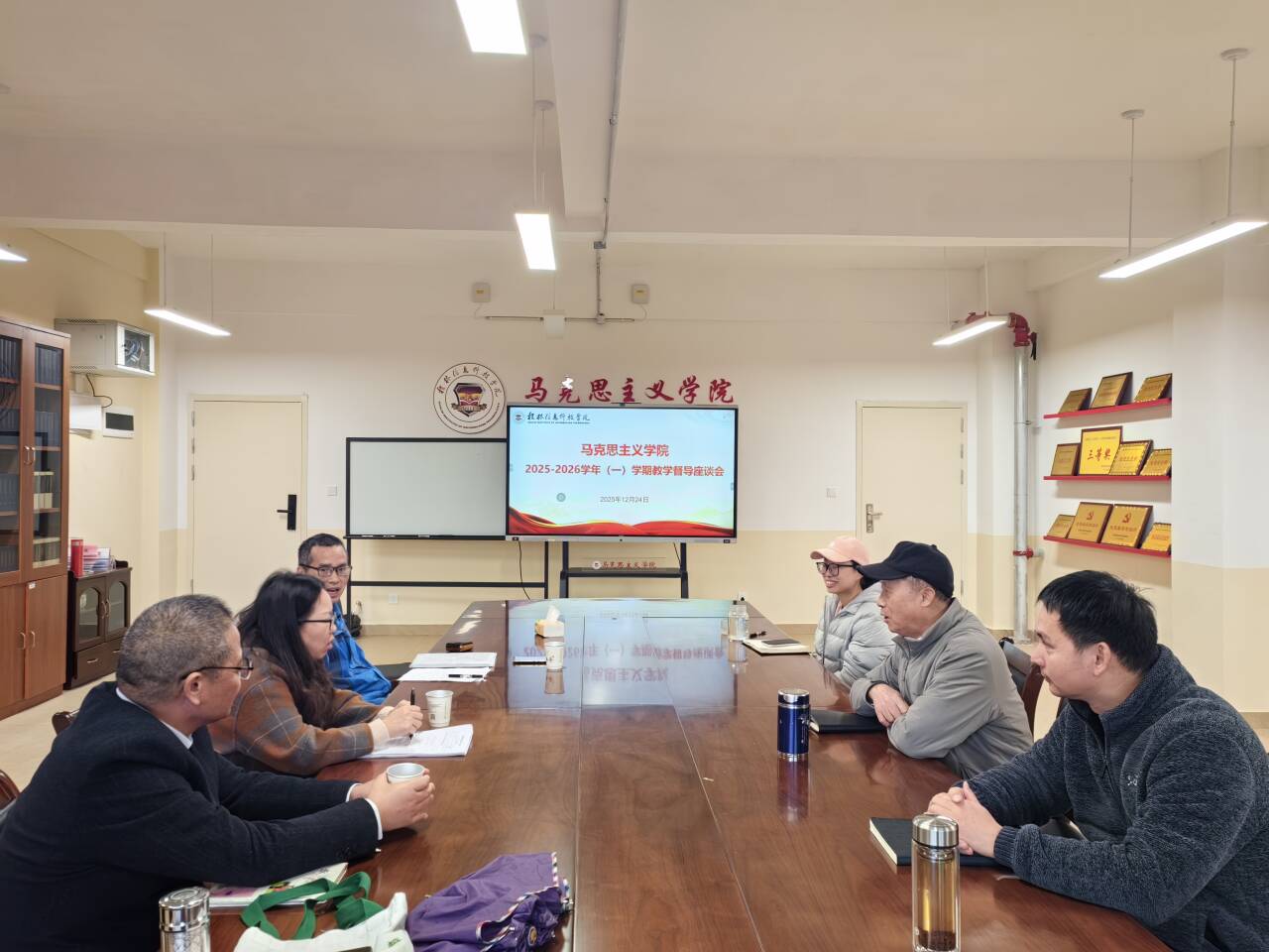 马克思主义学院组织召开2025年度秋季学期教学督导座谈会为深入贯彻落实立德树人根本任务,持续强化思政课教学质量监控,12月24日,马克思主义学院在G610会议室组织召开2025-2026学年第一学期教学督导座谈会。学院院长邱启照、党总支书记赵奕、副院长赖学良出席会议,学...
