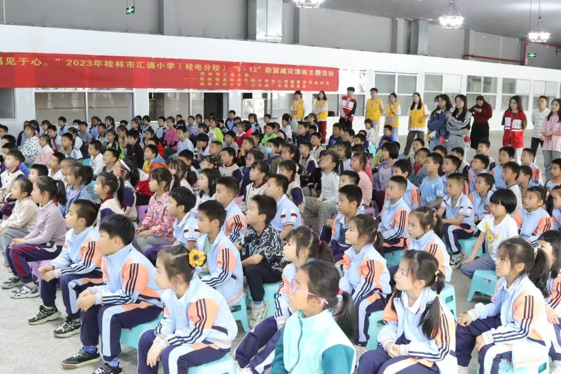 2023年大学生心理健康志愿者协会携手汇通小学开展“5·12”防震减灾演练...5月12日下午,为加强学校师生的防震减灾知识和自救技能,大学生心理健康志愿者协会联合红十字会在汇通小学进行了地震应急演练。此次演练由大学生心理健康中心主任、桂林市红十字心理救援队队长张承宗带队,共22名...