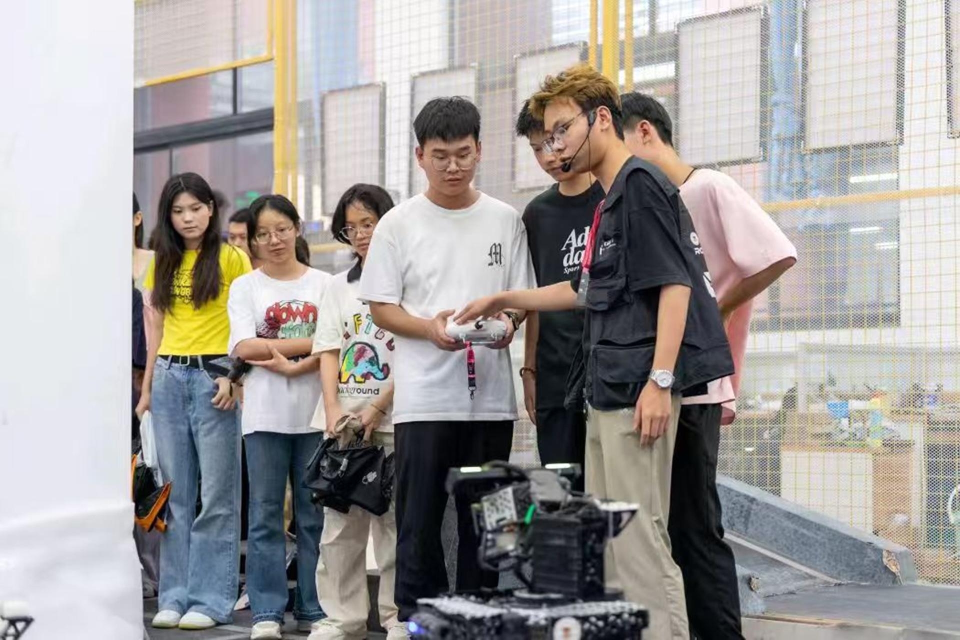 新生们依次参观了机器人创新实验室、大学生机电工程创新实践基地和大学生电子创新基地,并观看了机甲大师GIRT基地的宣传视频,聆听了优秀学长学姐们的经验分享。在现场演示环节中,学长邀请新生进行现场操控机器人体验。在他们的耐心指导下,同学们不再拘束,全身心投入到科技创新带来的乐趣中。丰硕的创新成果激起了同学们浓厚的兴趣,点燃了同学们心中的科创火种。
