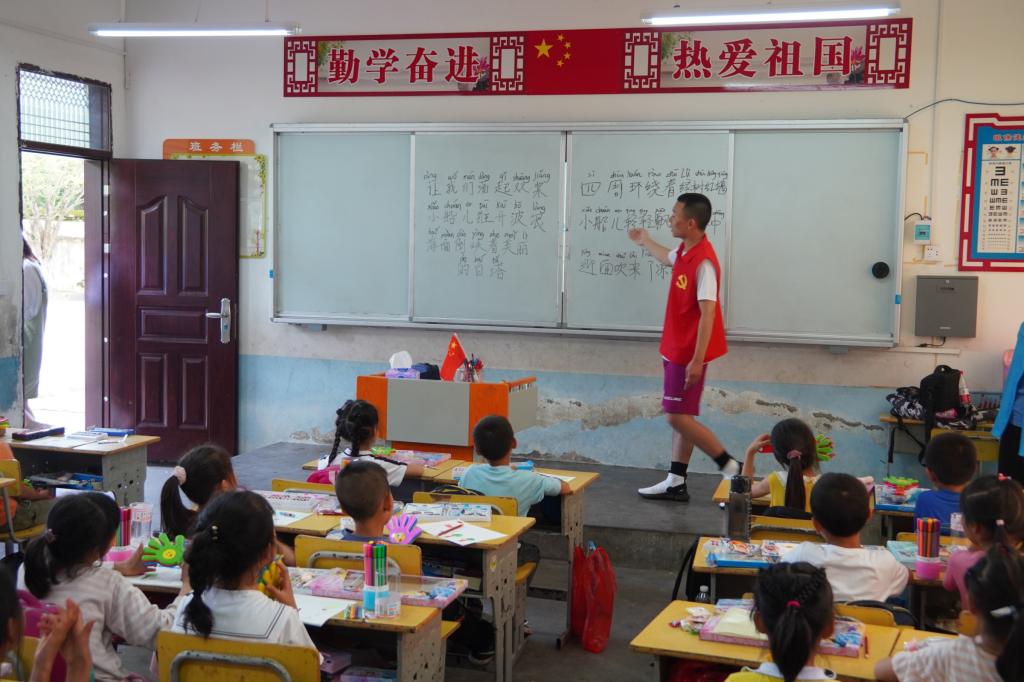 同学们来到灵川涧沙教学点为小朋友庆祝即将到来的六一儿童节,并给小朋友带来了丰富的礼物。活动中,“信息青年”志愿服务队成员通过视频让小朋友们了解关于党与国家的历史,并与小朋友一起画下了他们眼中的国家。随后“红色种子”党员先锋队成员给小朋友上了一节生动有趣的音乐课,学唱歌曲《让我们荡起双桨》。最后,信息工程系在涧沙教学点举行实践教育基地挂牌仪式,进一步拓宽了我系学生培育平台。