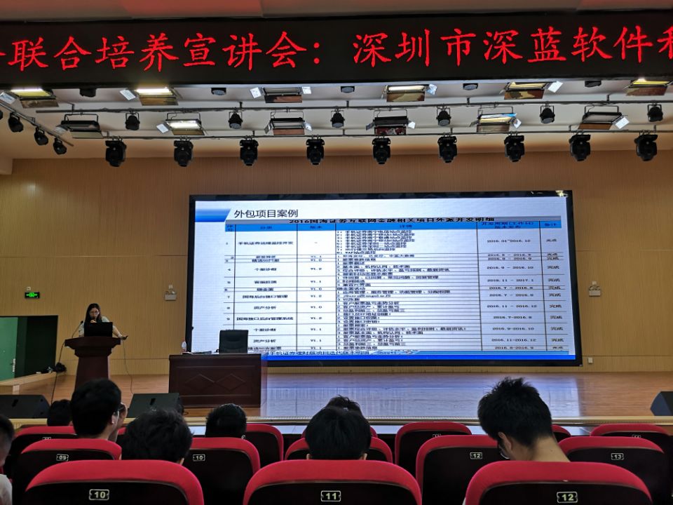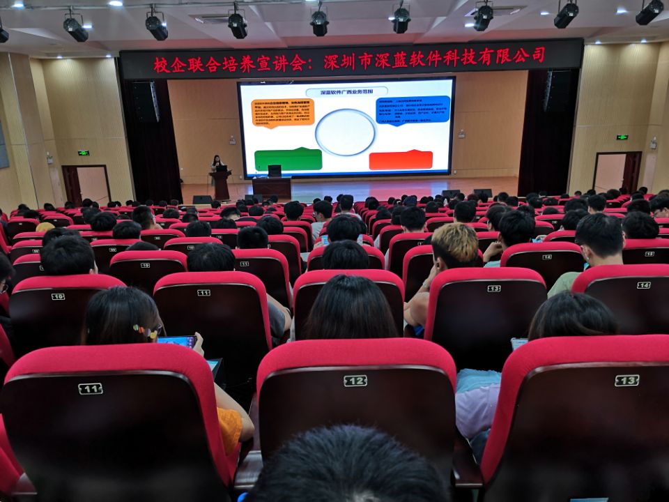 宣讲会中,肖玥经理从企业背景、发展前景、公司特色等方面详细介绍了企业的实际情况,得到同学们的高度认可。随后,技术顾问兰瑞江就深圳市深蓝软件校企联合培养进行相关说明,具体介绍了各个软件公司的招聘要求,并详细解读了IT行业在校生实习所要具备的能力及素质。
