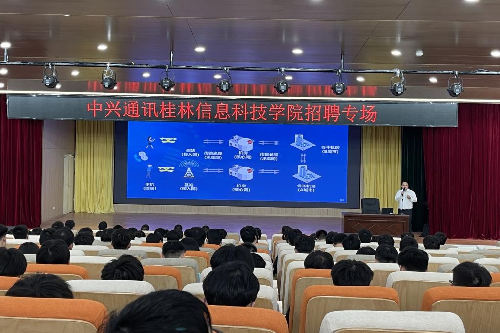 近日,信息工程学院邀请中兴通讯及其生态圈合作伙伴到校举行专场校园招聘宣讲会,中兴通讯国内营销外包总监李进强带领广西分公司同事及中兴生态圈合作伙伴西安中兴精诚通讯有限公司广西公司总经理凌滔滔,中徽建技术有限公司广西分公司总经理余林海;南京兴晟泽信息技术有限公司广西分公司总经理吴正华出席本次宣讲会,学院院长黄建灯、毕业班辅导员带队参加,本次宣讲会面向我院2024届所有专业毕业生,宣讲会于博文楼F107报告厅进行,现场座无虚席,学生反响热烈。