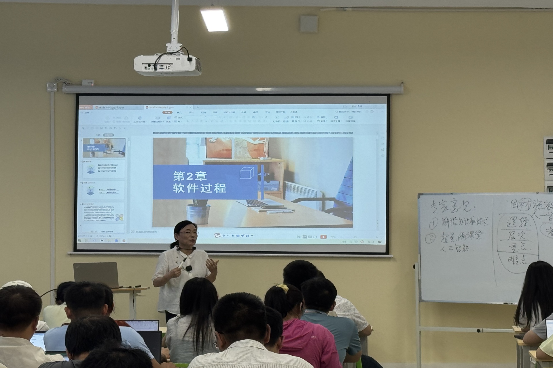 温教授的示范课亮点突出,为在场教师呈现了高质量教学示范:在前沿知识融入课堂上,以软件工程课程为例展示如何结合领域最新研究成果,强调教师需持续深耕领域知识;在教学平台融合运用方面,以学习通为例阐述数字化工具对提升教学质量与效率的关键作用;在因材施教环节,重点讲解学情调研实施方法(尤其专升本学生专业分析),阐述如何据此制定专属教学大纲,提出打破传统“PPT+板书”模式,引入翻转课堂、案例教学等方法,还展示了增加动画元素的改进后 PPT 以清晰呈现知识脉络;此外,她还进行翻转课堂模拟示范,结合虚拟学生回答动态调整讲解思路,以建筑工程为例引入软件工程的软件过程,深入浅出展现教学精髓,强调好的课堂设计应跳出教材 PPT 局限,通过精准提炼重难点和生动呈现吸引学生,这一理念引发在场教师广泛共鸣。